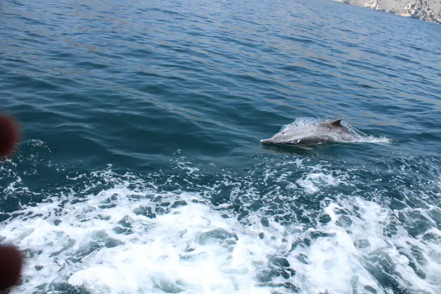 The boat moves into an area where dolphins are commonly seen. They sometimes swim alongside the dhow for a short while.